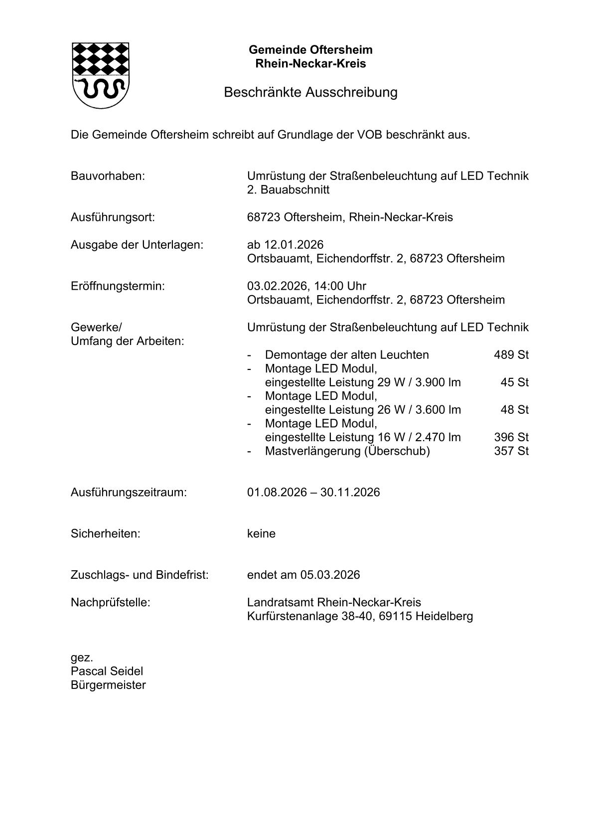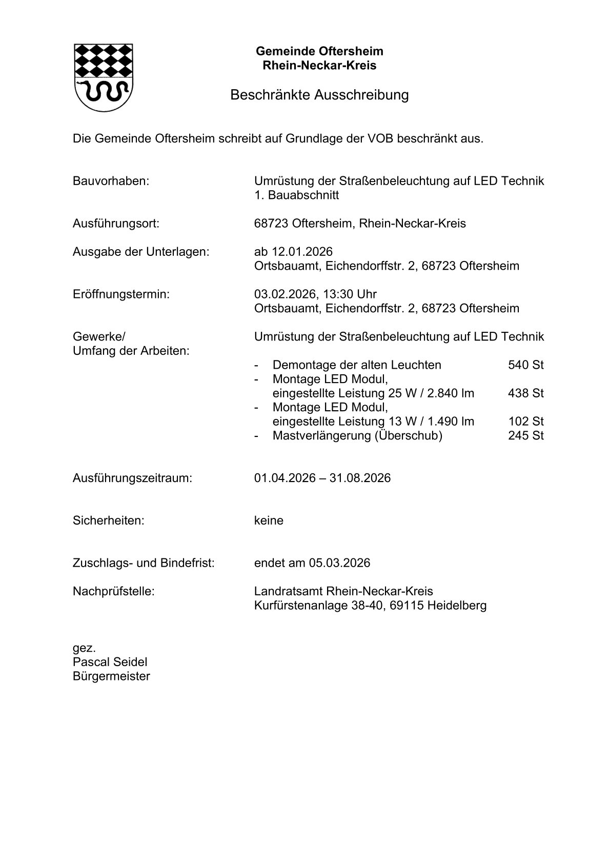 Die Gemeinde Oftersheim schreibt in Kürze im Rahmen von einer beschränkten Ausschreibung eine Wärmeversorgungsanlage für das Mehrfamilienwohnhaus in der Eichendorffstraße 10-12 in Oftersheim aus.