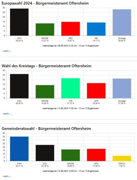 Der große Wahlsonntag 2024 ist vorbei, die vorläufigen Endergebnisse der Europa-, Kreistags- und Gemeinderatswahlen für Oftersheim liegen vor. Unter nachfolgendem Link Europawahl 2024 und Kommunalwahlen 2024 - Wahlenübersicht weitere Informationen bzw. Ergebnisse.