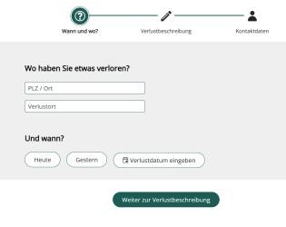Um einen vermissten Gegenstand zu finden, wählen Sie den Suchradius, das Datum des Verlusts und die Kategorie (z.B. Fahrrad, Handy). Nach Präzisierung der Suchkriterien können Sie die Suche starten. Bei Übereinstimmung mit einem gefundenen Gegenstand erhalten Sie in der Detailansicht auch die Kontaktdaten der Fundservicestelle.