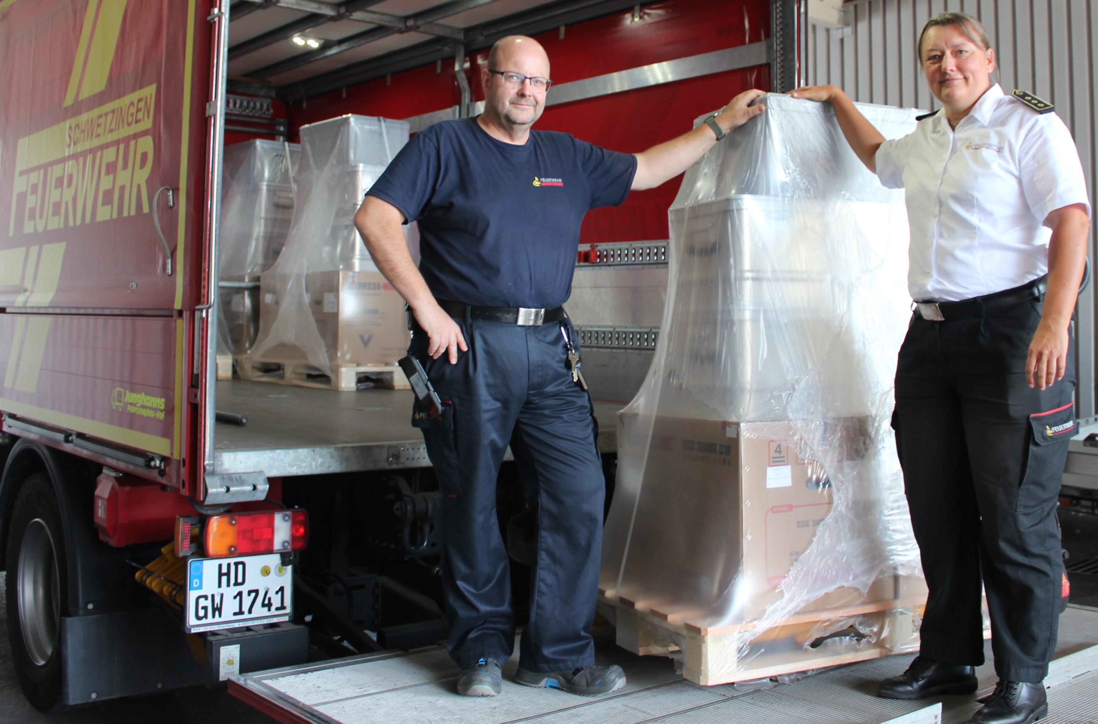 Das Ministerium des Inneren, für Digitalisierung und Kommunen Baden-Württemberg hat die Finanzierung übernommen und stellt den Städten und Gemeinden über die Landratsämter Musterausstattungssets zur Verfügung. Im Rhein-Neckar-Kreis hat das Amt für Feuerwehr und Katastrophenschutz in seinem Materiallager in Neidenstein die Ausstattungen nun an die 25 Kommunen (Auflistung siehe unten) ausgegeben, die zuvor einen Antrag gestellt hatten. 12 weitere Kommunen haben ebenfalls Anträge gestellt, die vom Landratsamt an das Innenministerium weitergeleitet werden. Hier wird mit einer Auslieferung im nächsten Jahr gerechnet.