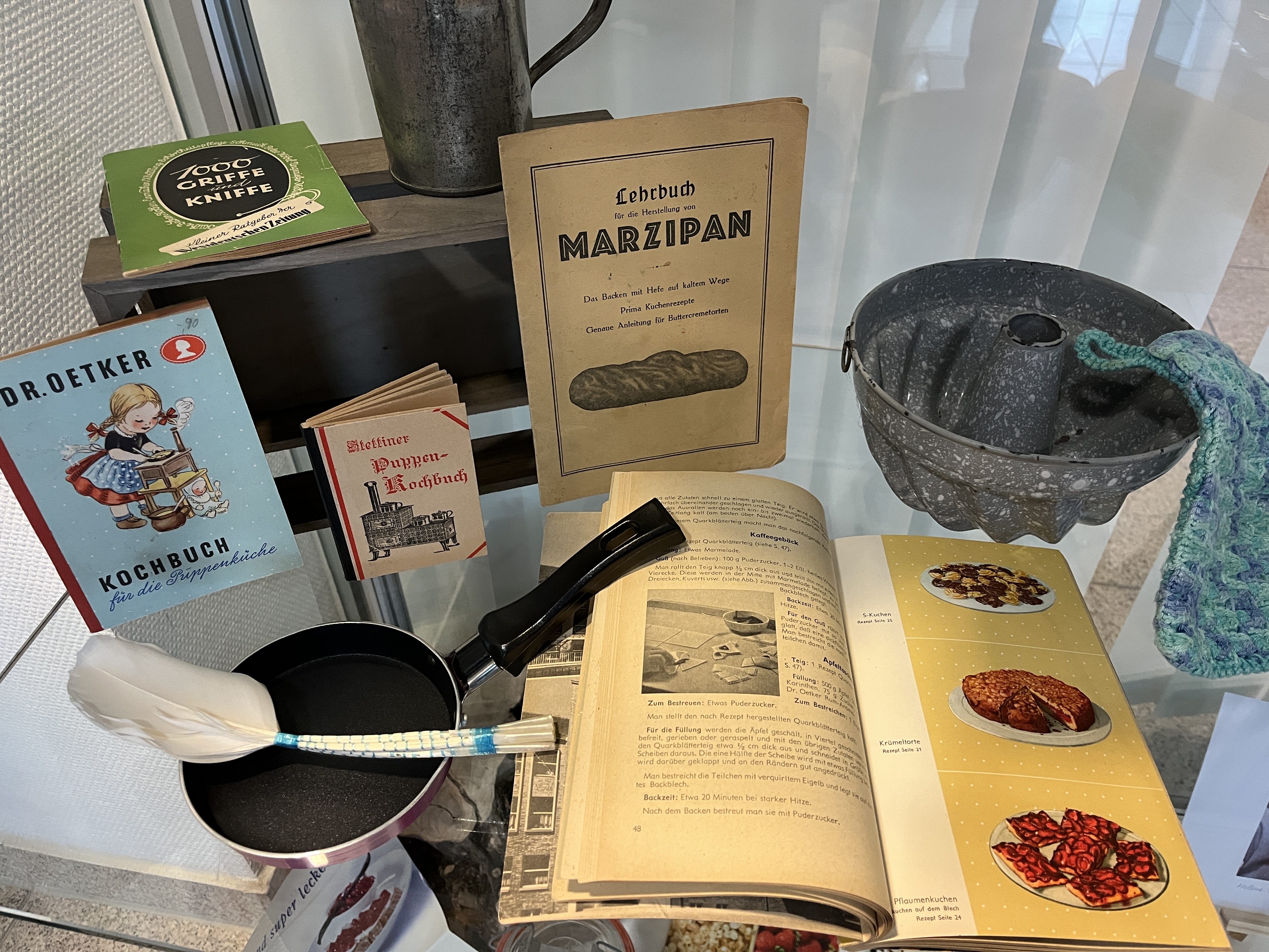 Die neuen Gegenstände hinter dem Glas erlauben einen Blick in die Küche früherer Zeiten. Während heute moderne elektrische Geräte den Teig rühren, Gemüse zerkleinern und Spätzle pressen, wurde früher alles von Hand gemacht – mit anderen Hilfsmitteln. Zu bestaunen gibt es zum Beispiel einen Federwisch, mit dem das Fett in der Pfanne verteilt wurde, alte Spätzlepressen und altertümliche Kochbücher. Die ausgestellten Exemplare sind von Charlotte D'Auria, Dorothea Müller und Yvonne Wierer.