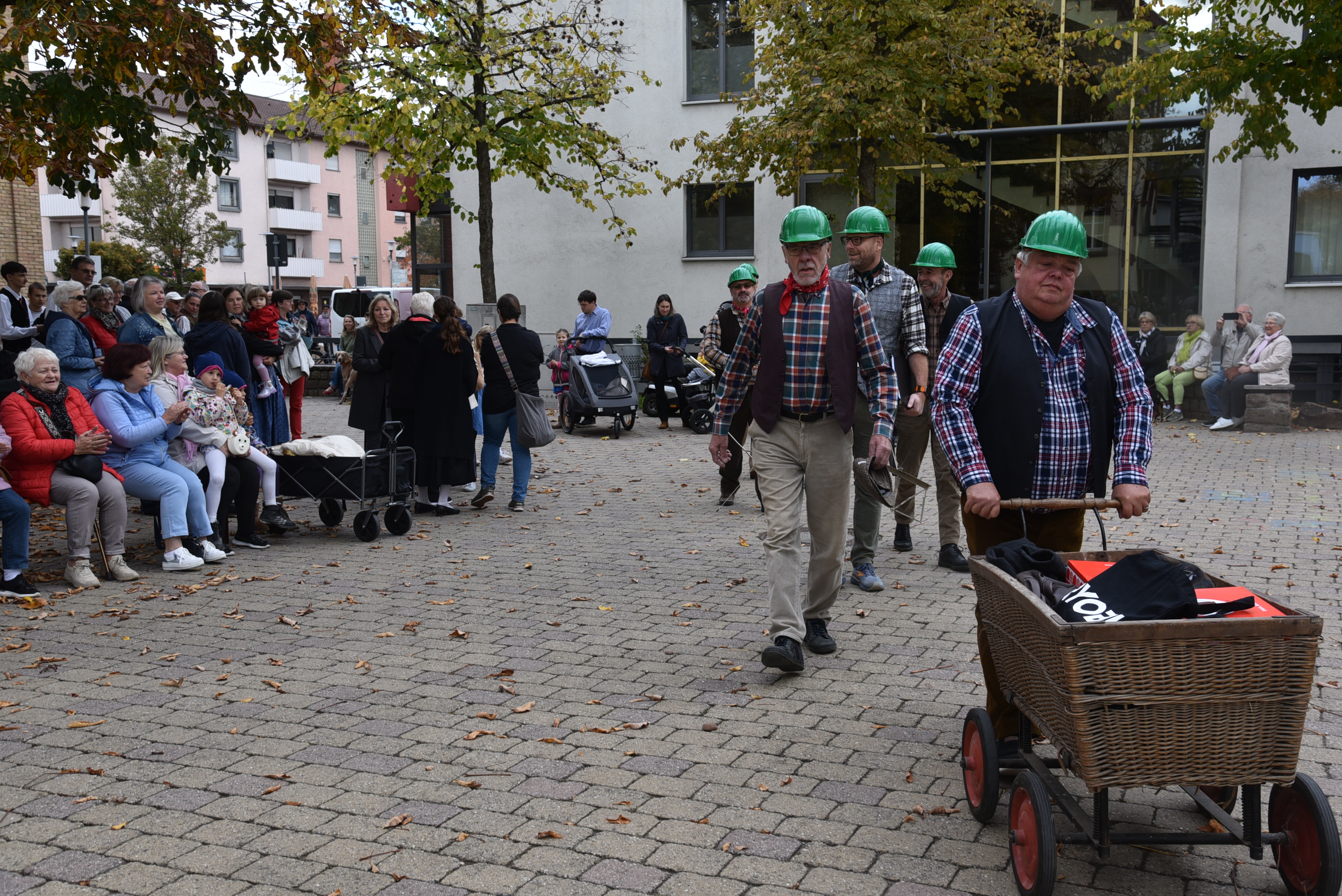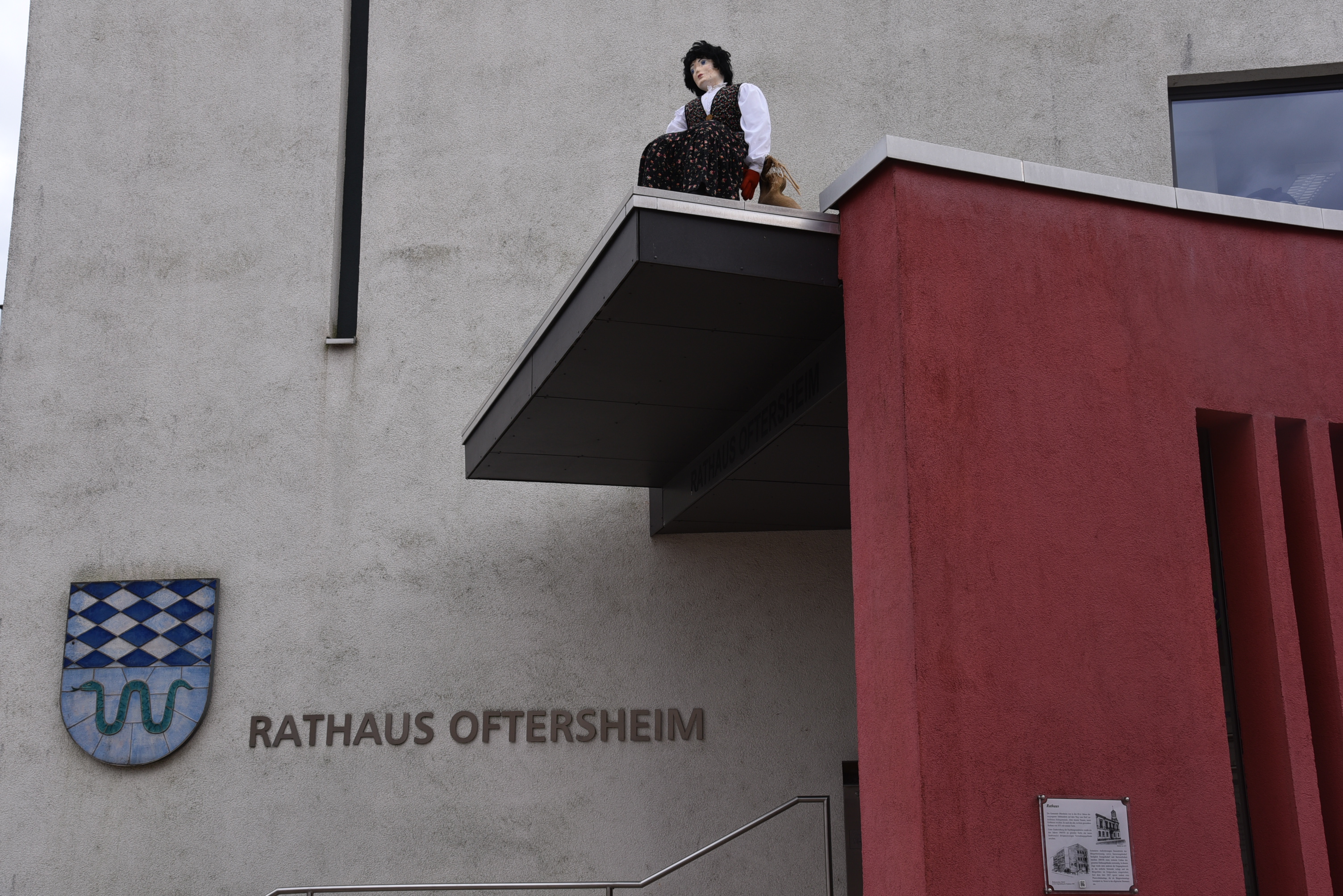 Und wer könnte die Ofdascha Kerwe besser zum Laufen bringen als die Kerweborscht?! Armin Wolf, Roger Hillengaß, Manfred Müller, Helmut Spieß, der ehemalige Bürgermeister Jens Geiß, Achim Mairle, Roland Munk und der Kerwekaplan Ingo Paul waren wieder in ihrem Element. Sie sorgten für Stimmung auf dem Schulhof. Passend zur Oftersheimer Baustellensituation kamen die Herren mit Bauhelmen - sicherheitshalber. Auch die Kerweschlumpel hatte ihren Auftritt: in diesem Jahr als „Gießlinde von de Friedhofskoschde“, sie hatte wie immer ihren Platz im Leiterwagen auf dem Schulhof. Aber es gab diesmal auch eine zweite, die Amtsschimmelgreta, sie hat auf dem Rathausvordach Platz genommen.