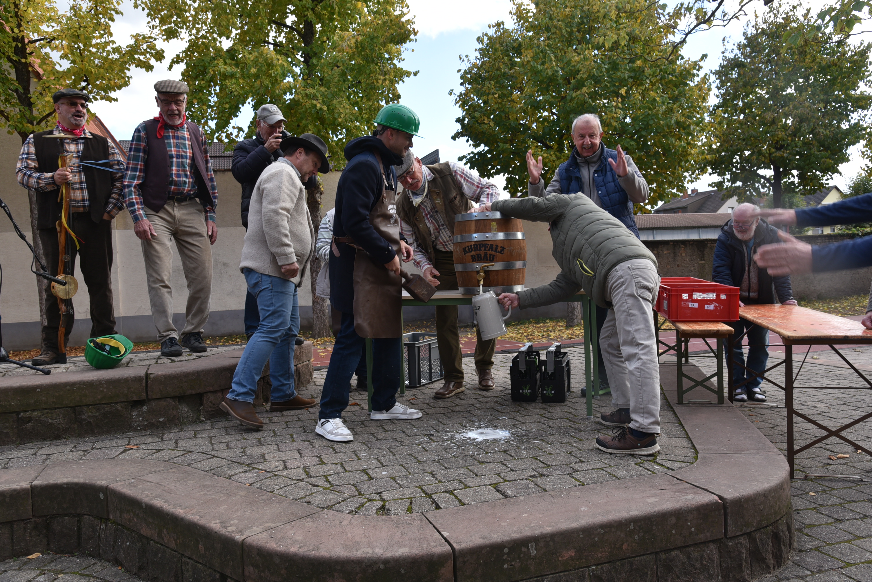 Die Begrüßung übernahmen schließlich der Vorsitzende des Heimat- und Kulturkreises, Dieter Burkard, und Bürgermeister Pascal Seidel. Spannend wurde es, als das Bierfass angestochen werden sollte. Der Rathauschef hatte alle Mühe, bis das frisch Gezapfte in Strömen floss und die Gäste im Schulhof ihr Glas Freibier holen konnten. Und es lag nicht an mangelndem Schwung mit dem Hammer…