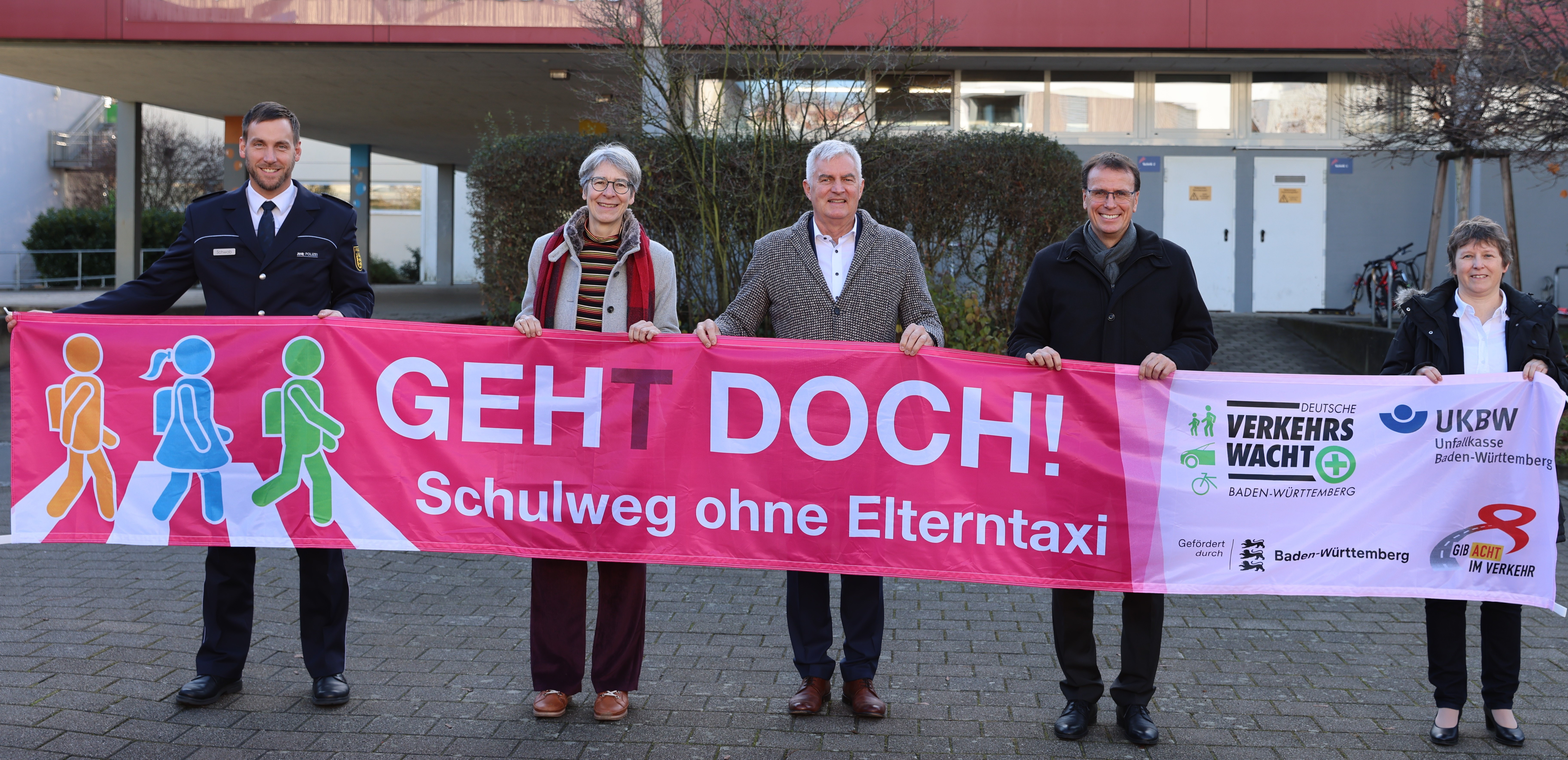 Die Landesverkehrswacht Baden-Württemberg e. V., die Unfallkasse BW sowie das Land Baden-Württemberg setzen sich gegen die steigende Zahl von Elterntaxis ein. Die Erhöhung der Verkehrssicherheit im unmittelbaren Schulumfeld, die gezielte Förderung der Eigenständigkeit von Kindern auf dem Schulweg und vor allem die Sensibilisierung der Erziehungsverantwortlichen für die Gefahren von Elterntaxis sind die erklärten Ziele des landesweiten Projekts „Geh(t) doch! – Schulweg ohne Elterntaxi“. Kurzzeitiges Halten in zweiter Reihe, plötzliches Wenden oder das Ein- und Aussteigen im fließenden Verkehr stellen ein erhebliches Risiko dar. Der Startschuss zu dieser gemeinsamen Aktion von Landesverkehrswacht Baden-Württemberg e. V., Unfallkasse Baden-Württemberg, Ministerium des Innern, für Digitalisierung und Kommunen, Ministerium für Verkehr sowie Ministerium für Kultus, Jugend und Sport fiel kürzlich in Korntal-Münchingen. In den kommenden Wochen werden rund 2.000 Banner in Baden-Württemberg für den sicheren Schulweg zu Fuß werben.