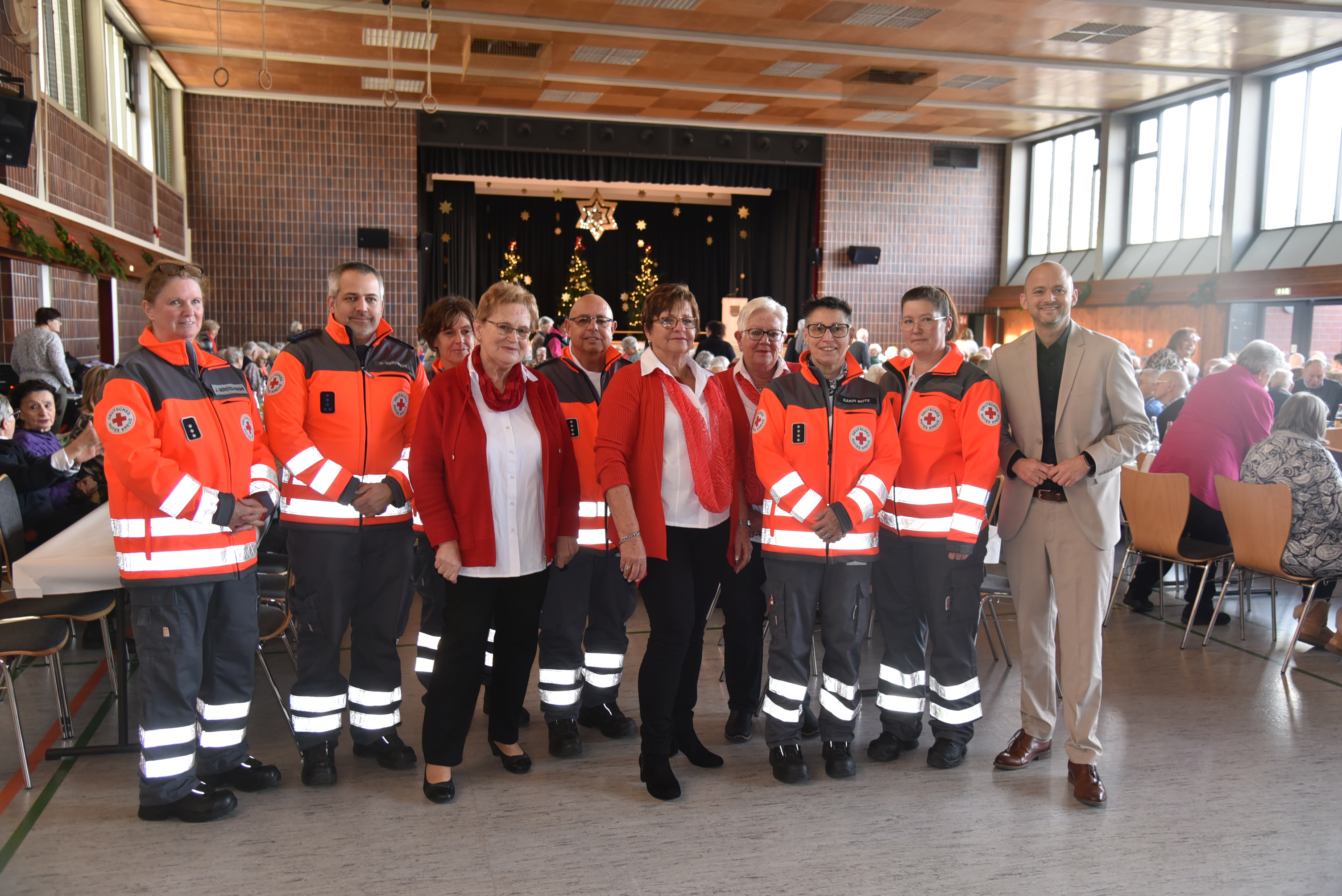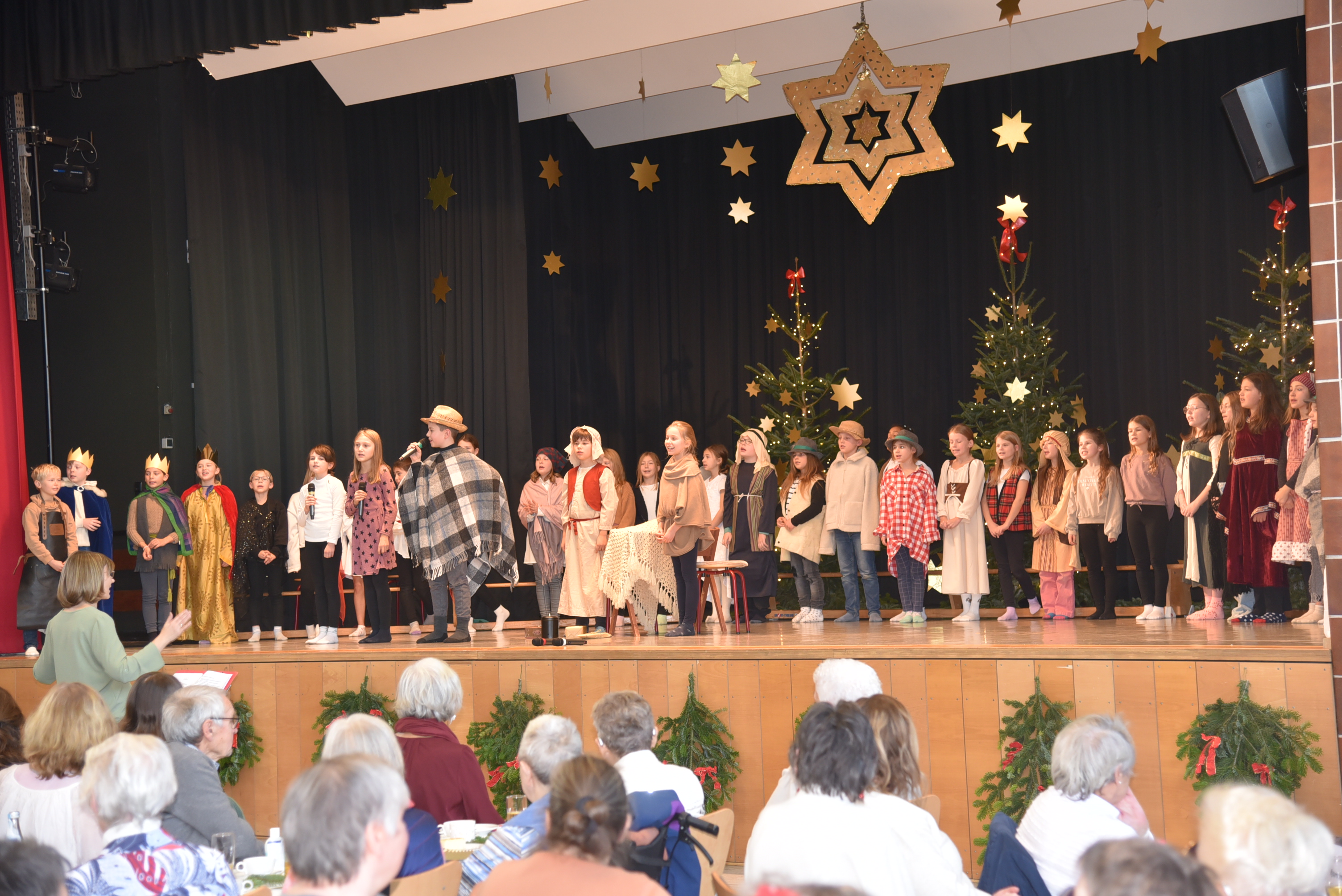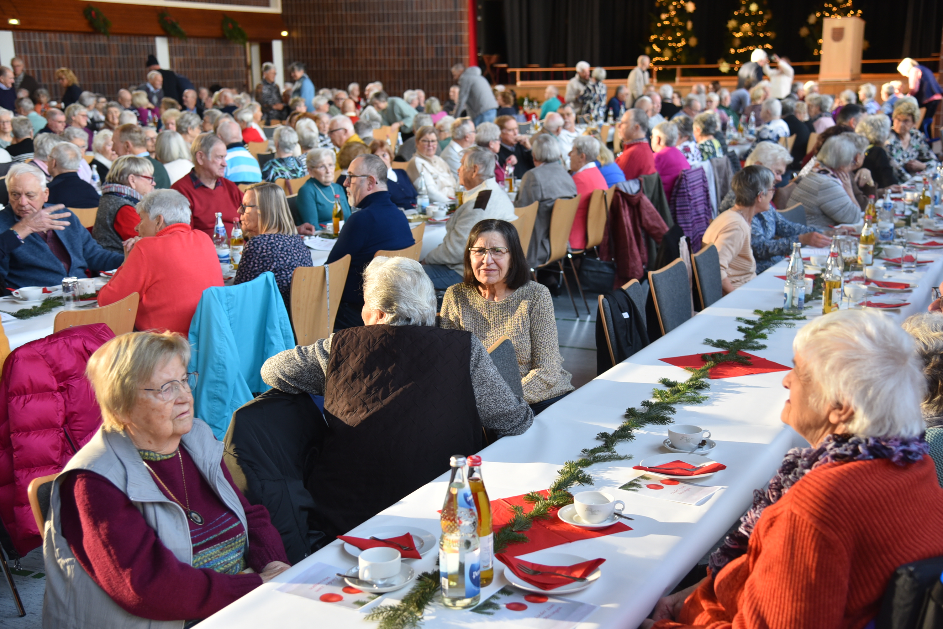 Fröhlich gestimmt trafen sich rund 450 Seniorinnen und Senioren zur Weihnachtsfeier der Gemeinde in der Kurpfalzhalle. Bürgermeister Pascal Seidel begrüßte die Anwesenden herzlich, darunter auch Ehrenbürger, Gemeinderät*innen und Vertreter*innen der Kirchen. Er freue sich, dass wieder so viele das Angebot angenommen hätten. Weihnachten sei ein Fest der Besinnlichkeit, des Schenkens und der Zuwendung und biete eine willkommene und nötige Auszeit. Die allgegenwärtigen Katastrophenmeldungen schienen manchmal zu überwiegen, sie überdeckten oft das Gute, das ebenfalls vielerorts zu finden ist. Oftersheim gehe es im Großen und Ganzen noch gut. Allerdings sei es um die Gemeindefinanzen derzeit nicht so gut bestellt. Die Gemeinde müsse sparen. Das habe schon für den ein oder anderen Unmut im ablaufenden Jahr gesorgt. Aber, so betonte der Rathauschef, unsere Erfolge beruhten darauf, dass alle gemeinsam die Probleme angehen, dass sich viele für Oftersheim verantwortlich fühlen. Er zitierte den Kerwepfarrer, Ingo Paul, „Ofdasche sind wir alle! Dann warf er einen kurzen Blick zurück auf das ablaufende Jahr.Zum Schluss dankte er allen Beteiligten für ihre Mithilfe, vor allem Ute Walter vom Seniorenbüro für die Organisation. Essen und Trinken wurde von Mitarbeiter*innen der Gemeindeverwaltung sowie von Helferinnen der Evangelischen Kirchengemeinde an den Tischen serviert. Nach dem gemeinsamen Kaffeetrinken führten Schülerinnen und Schüler der Friedrich-Ebert-Schule das Weihnachtsmusical „Stern über Bethlehem“ auf. Im Anschluss wurde dann gemeinsam gesungen. Unter der Leitung von Elisabeth Groß vom TSV Oftersheim zeigten schließlich rüstige Seniorinnen, wie man mit einem Rollator tanzt, und die Leimbachnixen machten rhythmische Sportgymnastik zu Weihnachtsmusik.