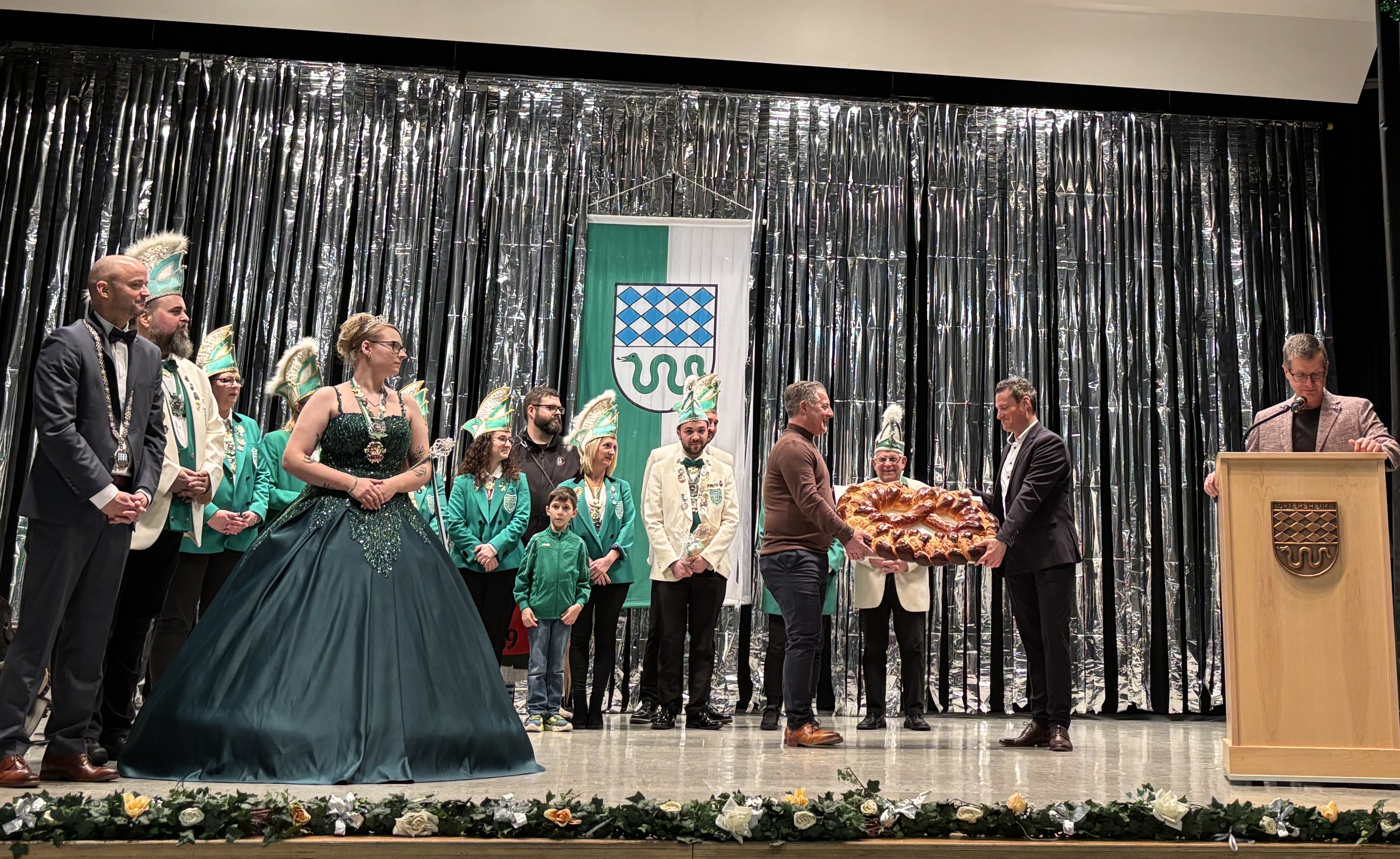 Neben der Neujahrsbretzel, die Markus Lauff und Detlev Bechtel vom Vereinskartell überreichten und die Glück für das neue Jahr bringen soll, kamen auch der C.C. Grün-Weiß mit ihrer Prinzessin Louisa I. die Liebliche auf die Bühne, um dem Bürgermeister ein Präsent und den Orden zu übergeben. Nach ein paar Worten der diesjährigen Karnevalsprinzessin sprach Markus Lauff als Vorsitzender des Vereinskartells noch ein paar Worte. Er lobte nicht nur das unglaubliche Engagement der einzelnen Bürgerinnen und Bürger in den Vereinen, sondern äußerte auch Vorfreude auf die kommenden Veranstaltungen.