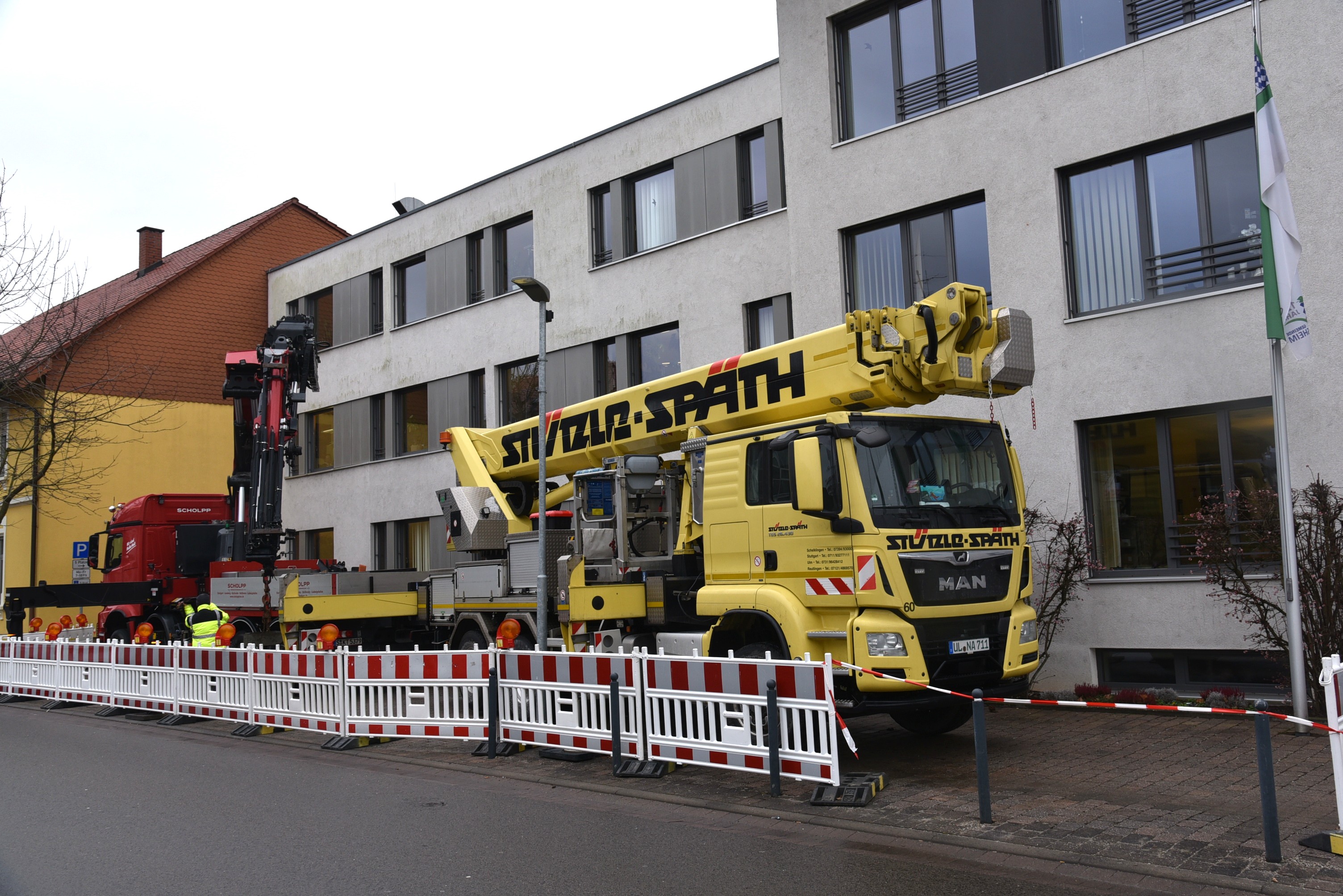 Auf dem Rathausdach wird eine neue Mobilfunkantenne dauerhaft montiert. Deshalb stehen am Rathaus derzeit Schwerlastkräne und schweres Arbeitsgerät.