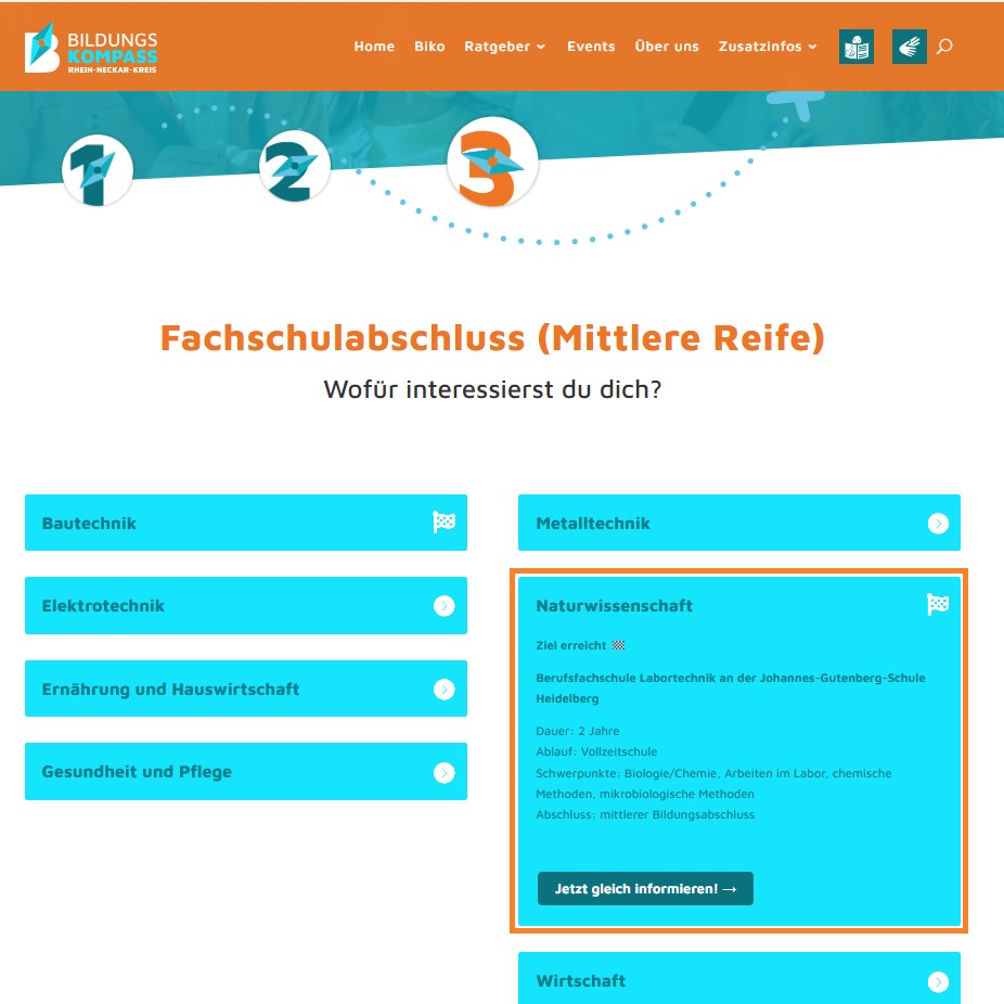 Die Kooperation mit der Stadt Heidelberg ermöglicht es einerseits, mit dem Biko noch mehr junge Menschen im Übergangsbereich zu unterstützen, andererseits zeigt er Jugendlichen im Rhein-Neckar-Kreis sowie im Stadtgebiet nun ein noch größeres Spektrum an Möglichkeiten auf. So gibt es durch die Integration der Heidelberger Bildungsangebote jetzt auch Bereiche wie Orthopädietechnik, Mediengestaltung, Labortechnik oder Fotografie, die von den beruflichen Schulen des Rhein-Neckar-Kreises nicht abgedeckt werden. „Die Zusammenarbeit mit dem Rhein-Neckar-Kreis zeigt, wie regionale Bildung gemeinsam gedacht werden kann. Der Bildungskompass macht die Vielfalt der Heidelberger Schulangebote sichtbarer – und eröffnet Jugendlichen aus Stadt und Umland neue Perspektiven“, so Sascha Lieneweg, Leiter des Amtes für Schule und Bildung der Stadt Heidelberg.